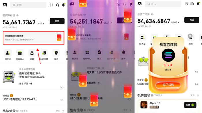 · 按首页提示点击「红包」,即可获得随机数量的热门代币奖励;